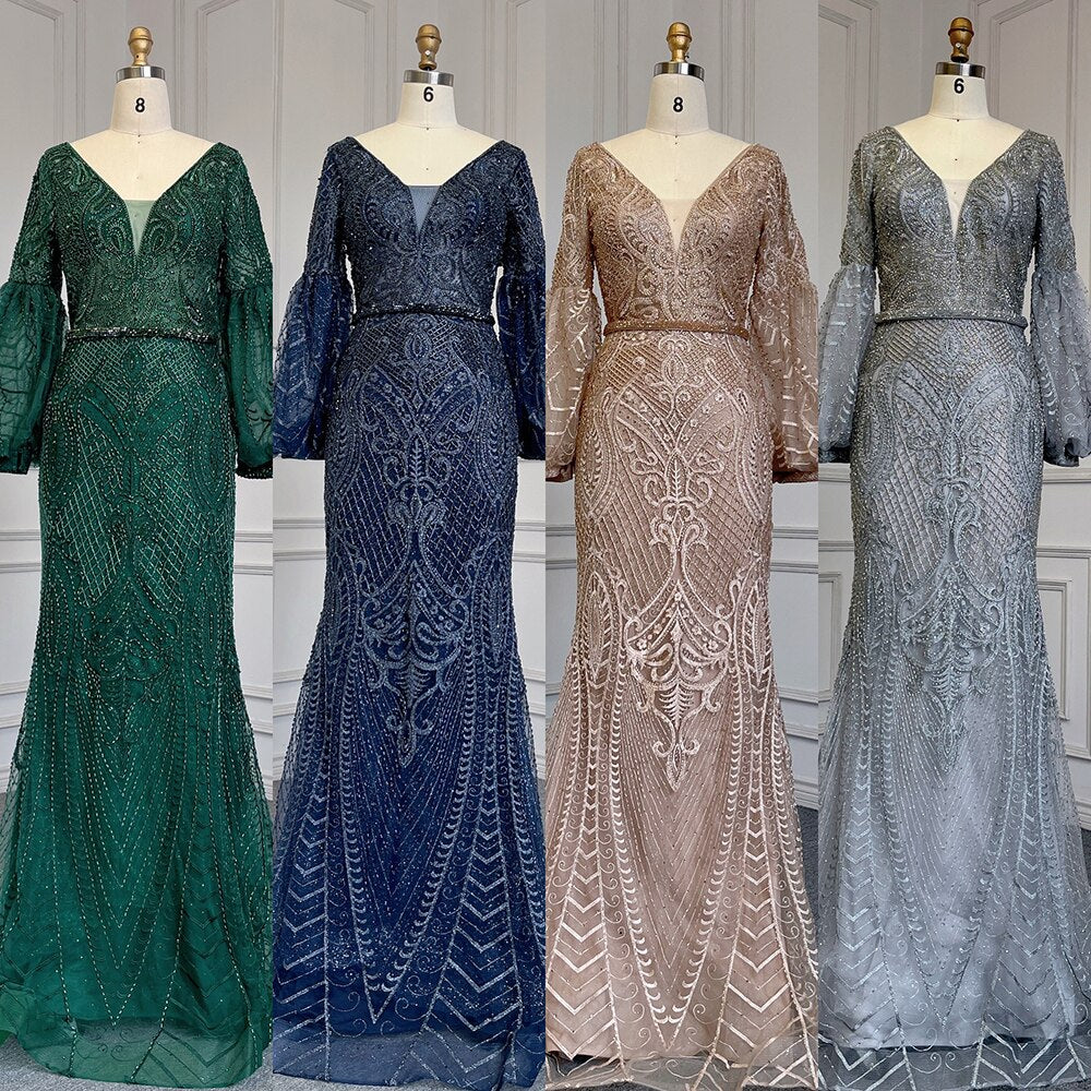 Muslim Green Mermaid Elegant Puff Sleeves V-Neck Evening Dresses Gowns Luxury Beaded 2025 For Women Party LA71744