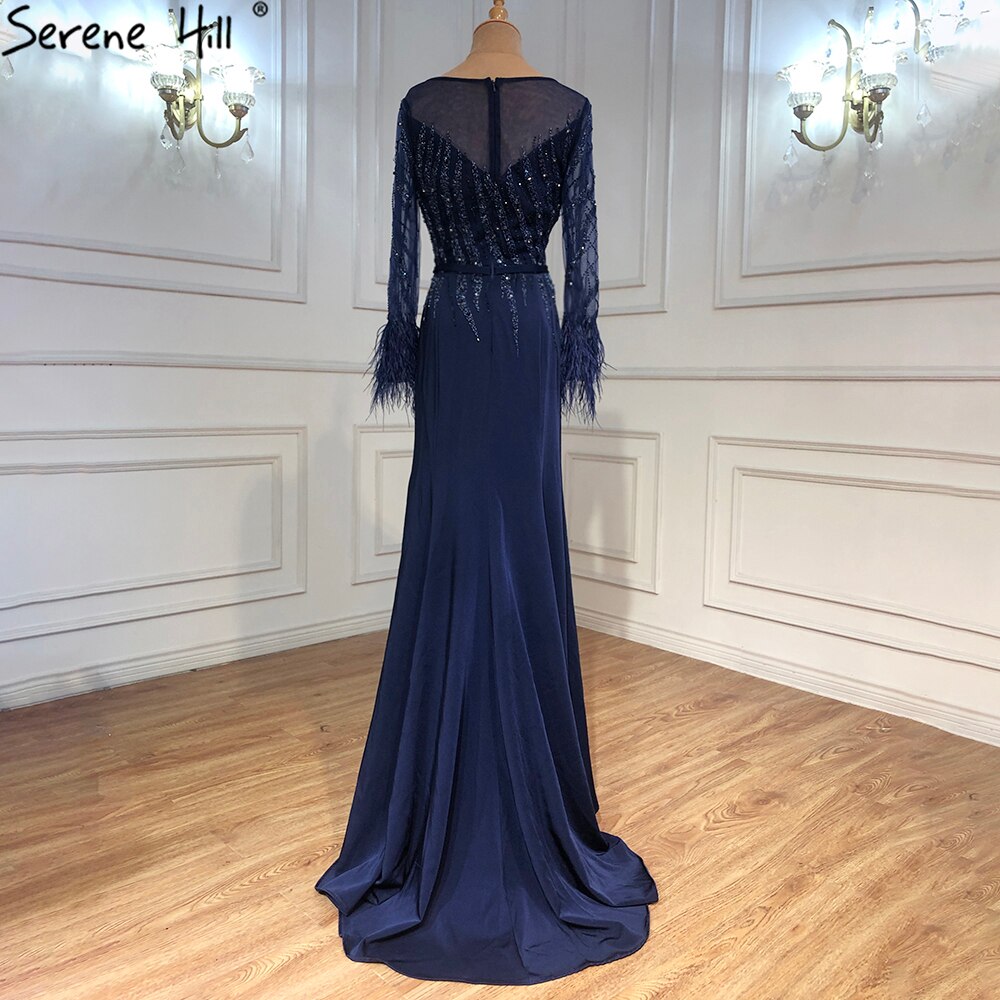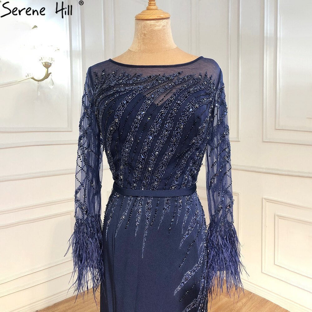 Muslim Navy Blue Meramaid Evening Dresses Gowns 2025 Luxury Elegant Beaded Feather For Women Party LA70978A