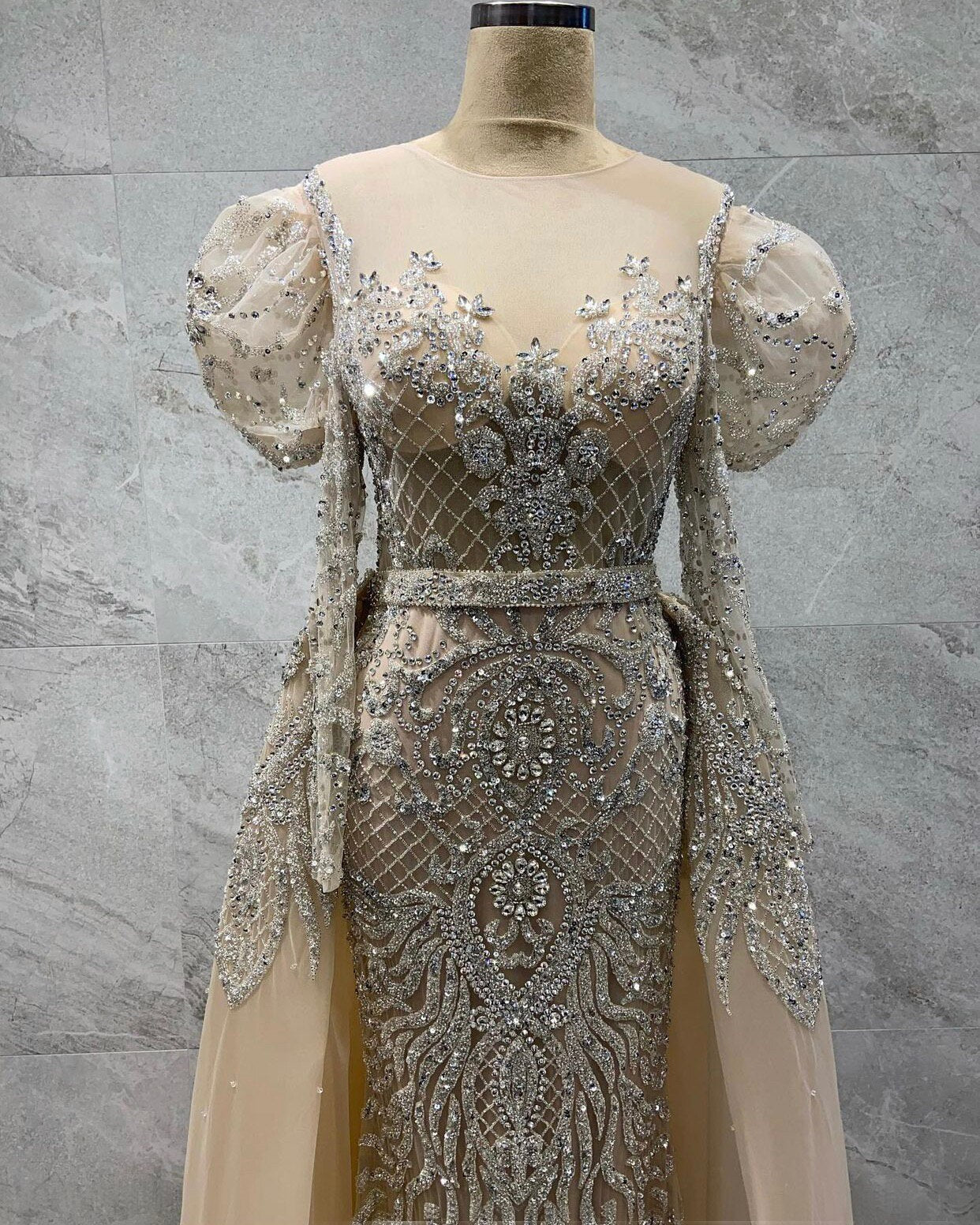 Muslim Nude Silver Mermaid Evening Dresses Gowns 2025 Beaded Elegant Luxury Overskirt For Woman Party LA71352
