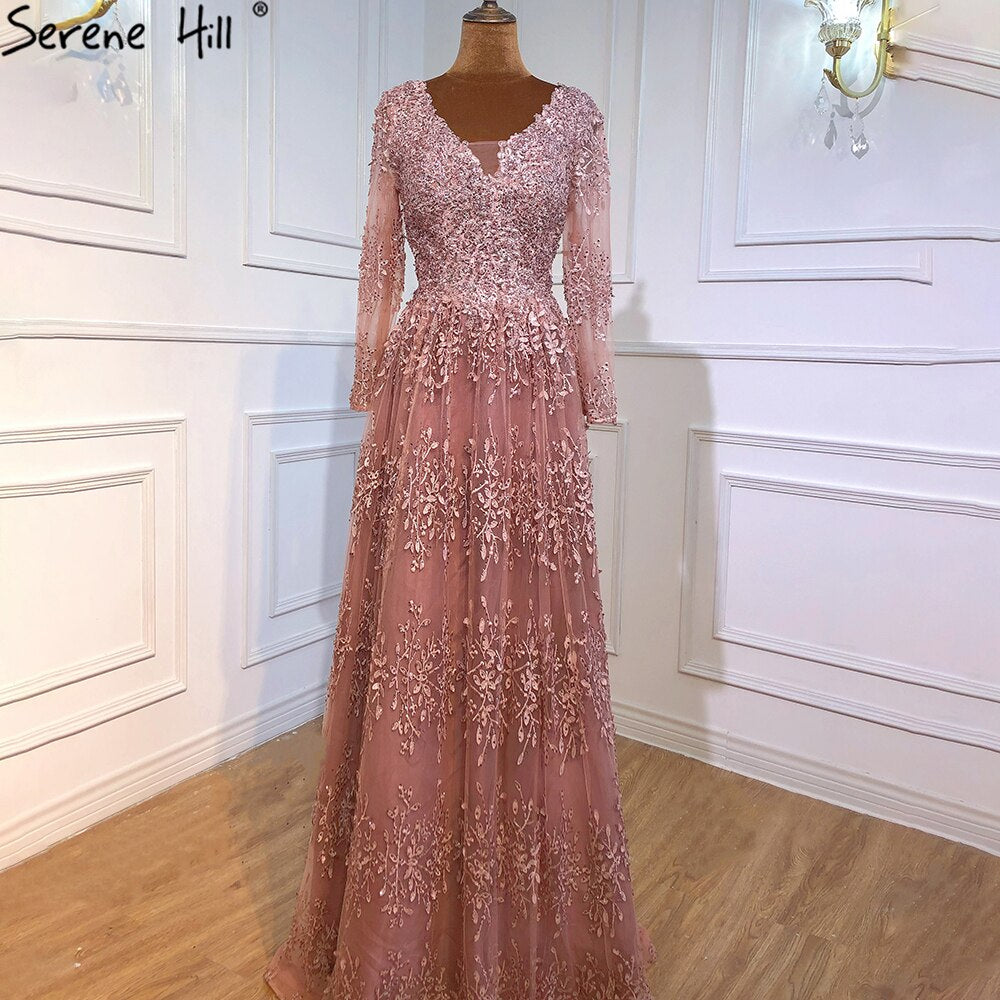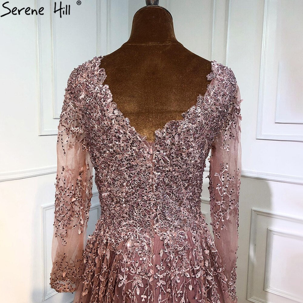 Muslim Pink Luxury Evening Dresses Gowns 2025 Long Sleeves Crystal A-Line For Women Party LA70729
