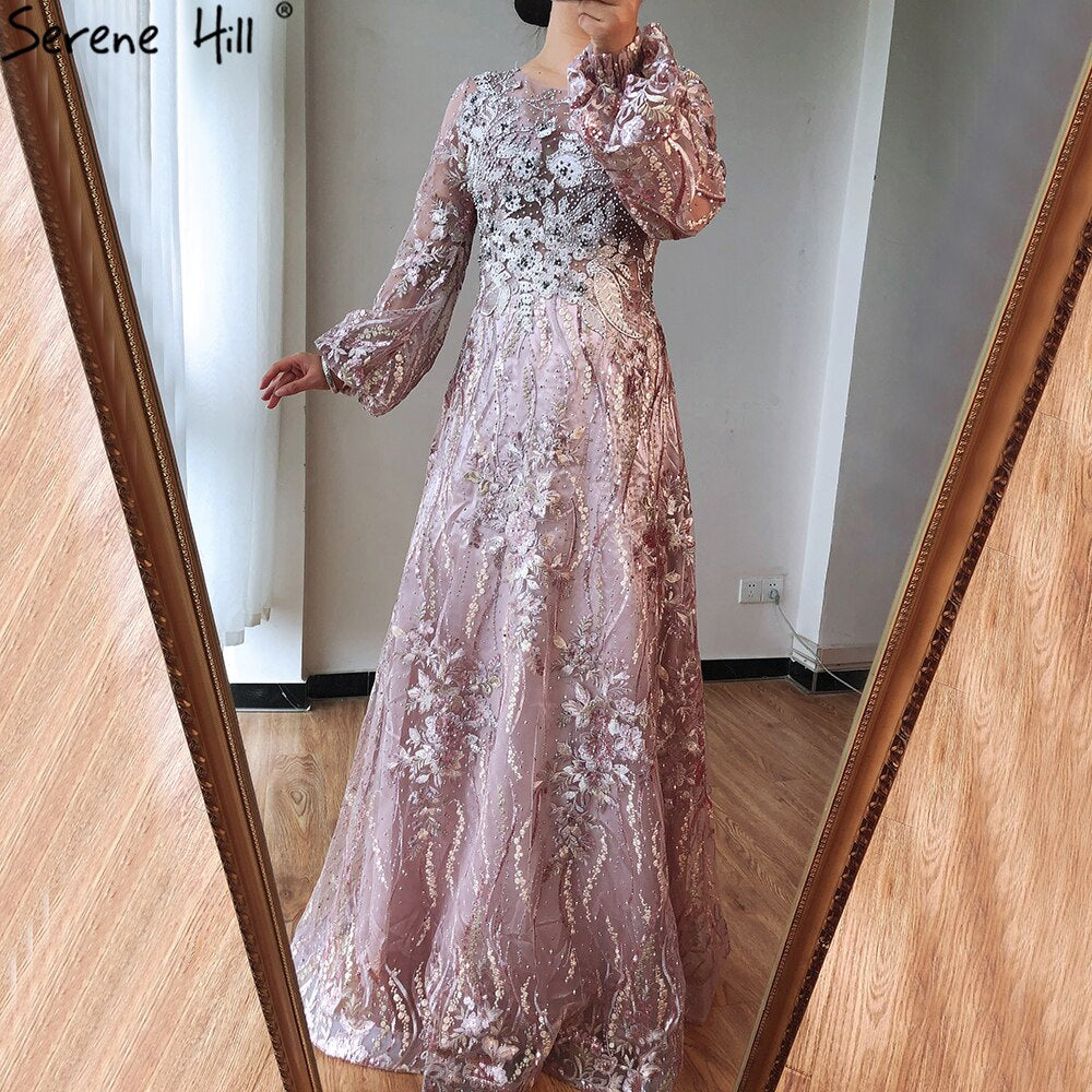 Muslim Pink Luxury Evening Gowns 2025 Flowers Crytsal Long Lantern Sleeves Formal Dress Design LA70779