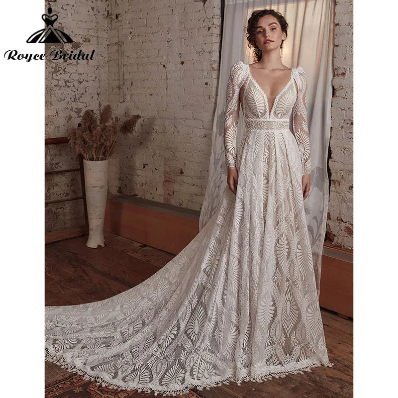 Sexy Bohemian Boho Wedding Dress with Detachable Long Sleeve A Line Beach Deep V Neck Lace Backless Spaghetti Straps Bridal Gown