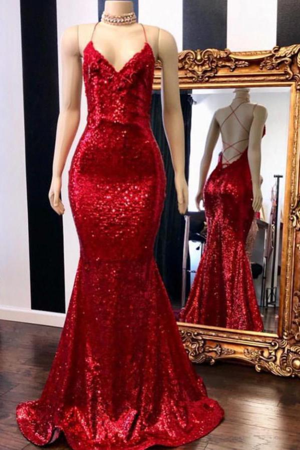 Sexy Spaghetti-Strapss V-Neck Mermaid Prom Dress Sequins Red Long