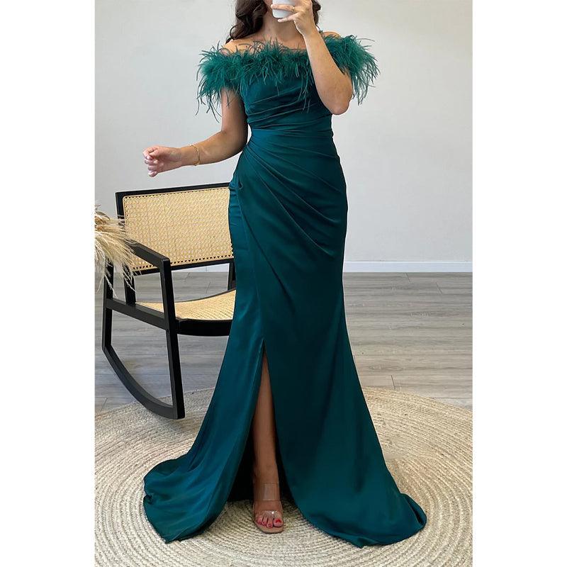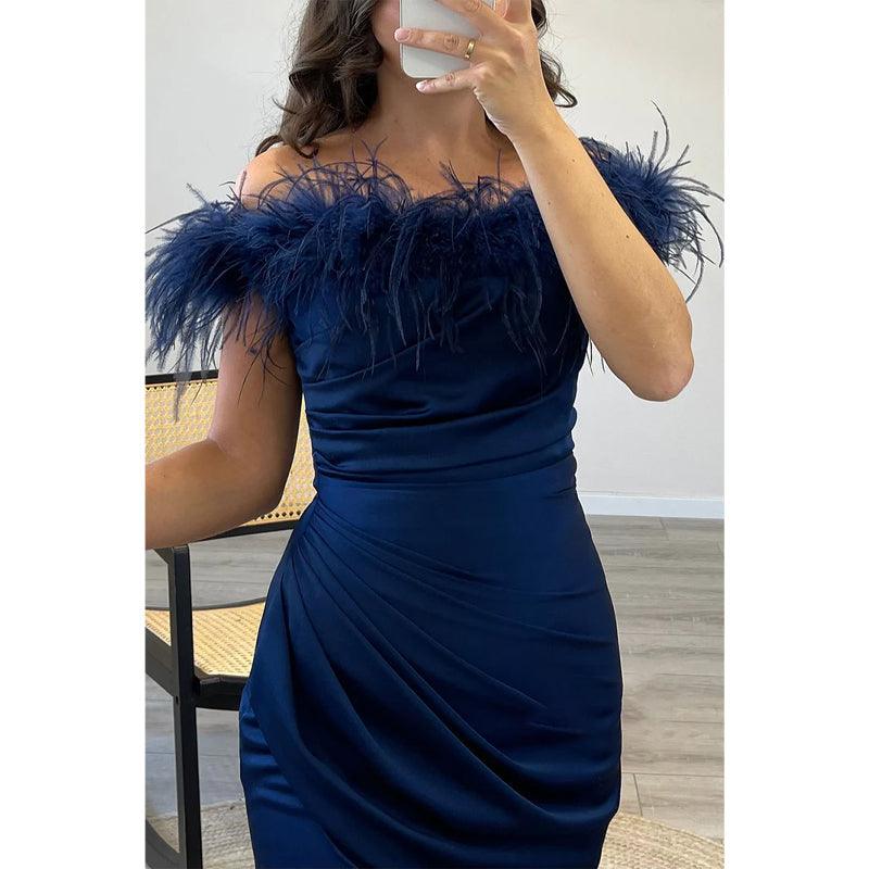 Sheath/column Off-shoulder Feather Saitn Long Prom Evening Dress