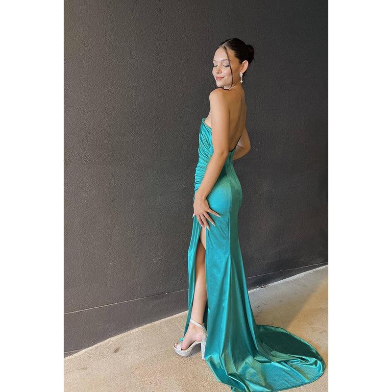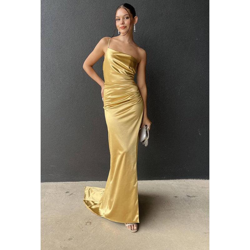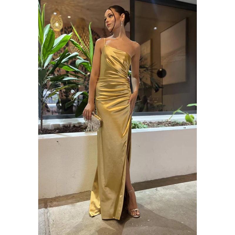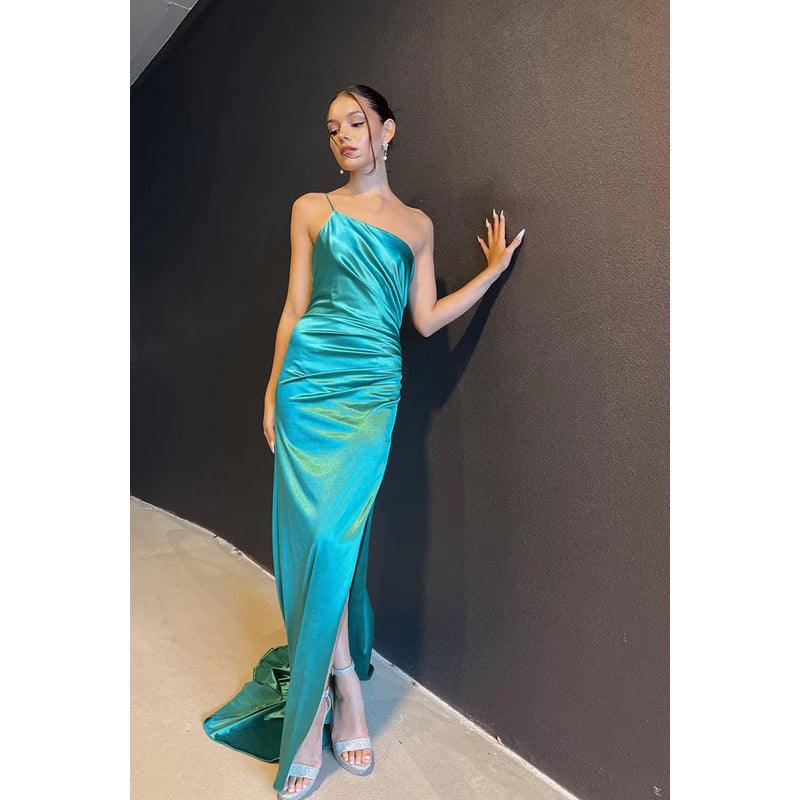 Sheath/Column One Shoulder Satin Pleats Backless Sleeveless Evening Dress