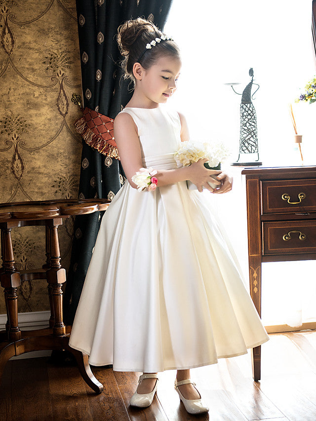 Short Princess Satin Jewel Neck Wedding First Communion Flower Girl Dresses