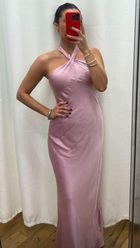 Simple Halter-Neck Pink Satin Long Prom Dress Formal Evening Dress Y8450