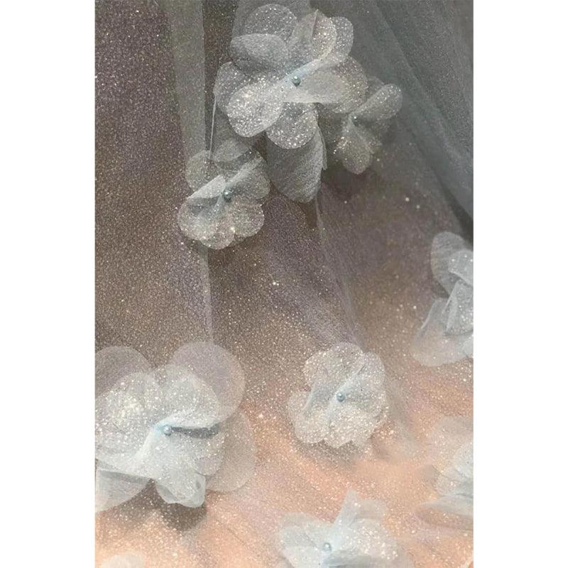 Sky Blue Tulle Strapless 3d Appliques A-line Long Prom Dress with Slit