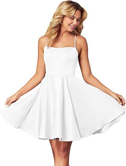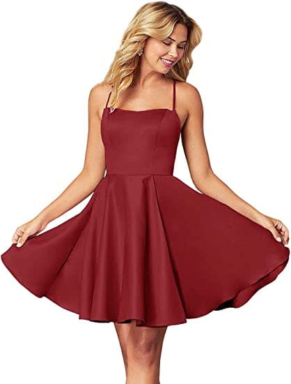 Look stunning at your next event with our Spaghetti Straps Homecoming Dress. This A Line dress features a flattering scoop neck. criss-cross back design. and convenient pockets. The built-in bra and knee length provide both style and comfort. Perfect for teens and juniors. this dress will make you stand out and feel confident at any formal party.