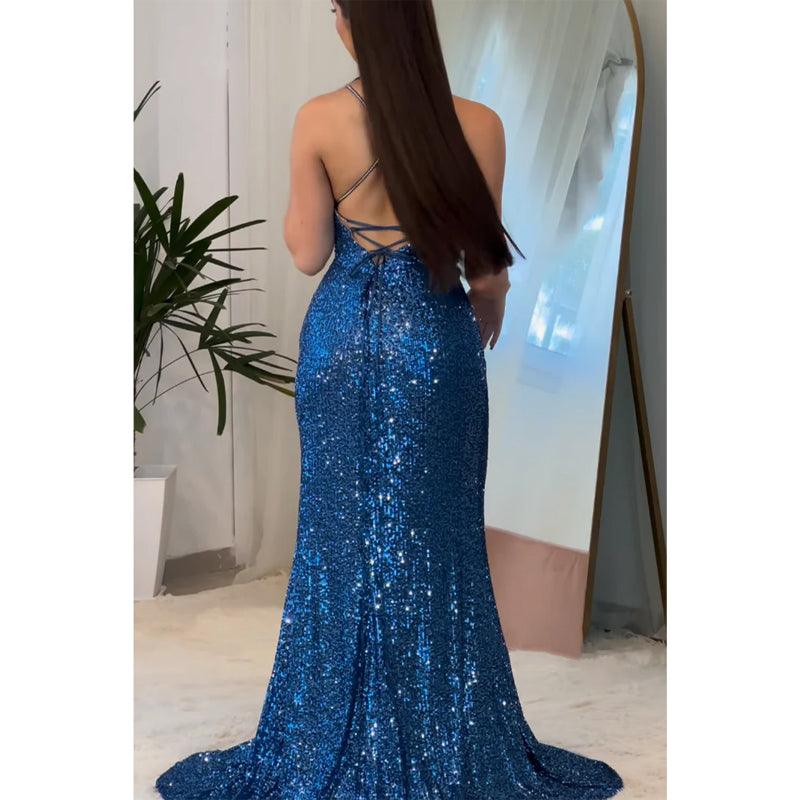 Sparkly Bateau Spaghetti Straps with Side Slit Party Prom Evening Dress
