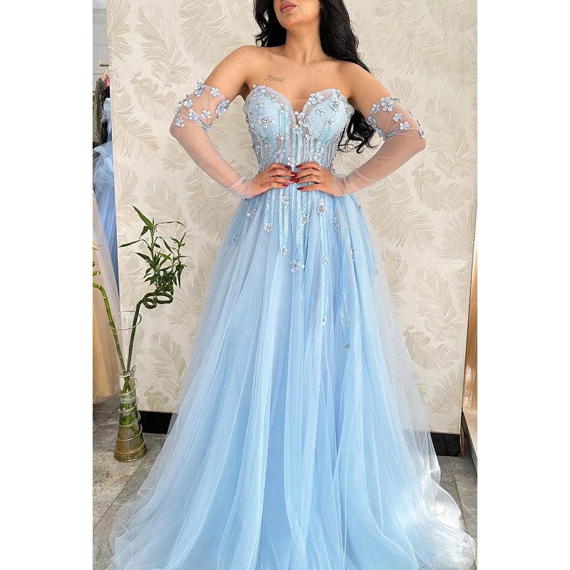 Sweetheart Strapless Appliqued Beaded Tulle A-Line Long Evening Dress