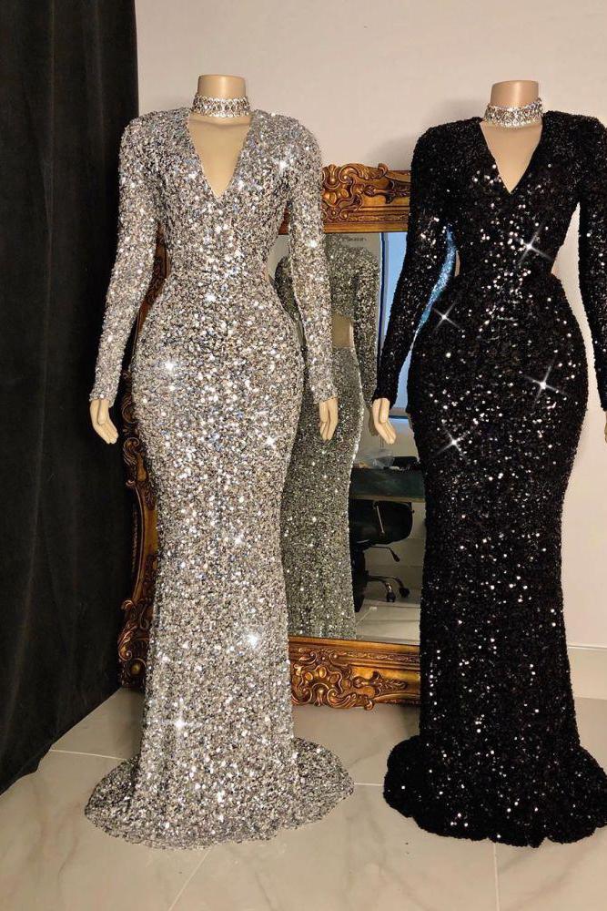 Stunning Crystal Sequins Long Sleeves V-Neck Mermaid Prom Dresses