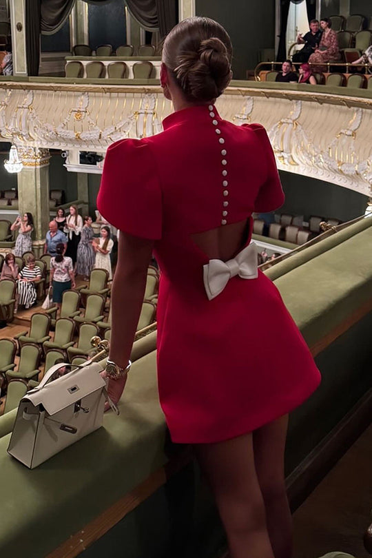 Sweet Moment Slit Short Sleeve Backless Removable Satin Bow Mini Dress