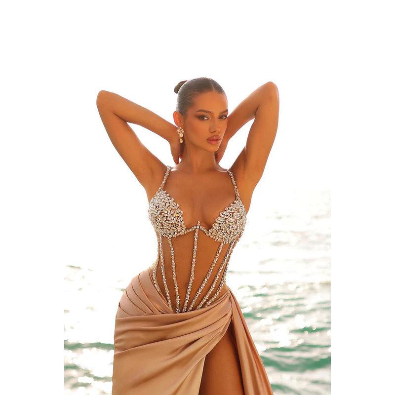 Sweetheart Beaded Sheer Tulle Ruched Satin Sheath Long Evening Dress