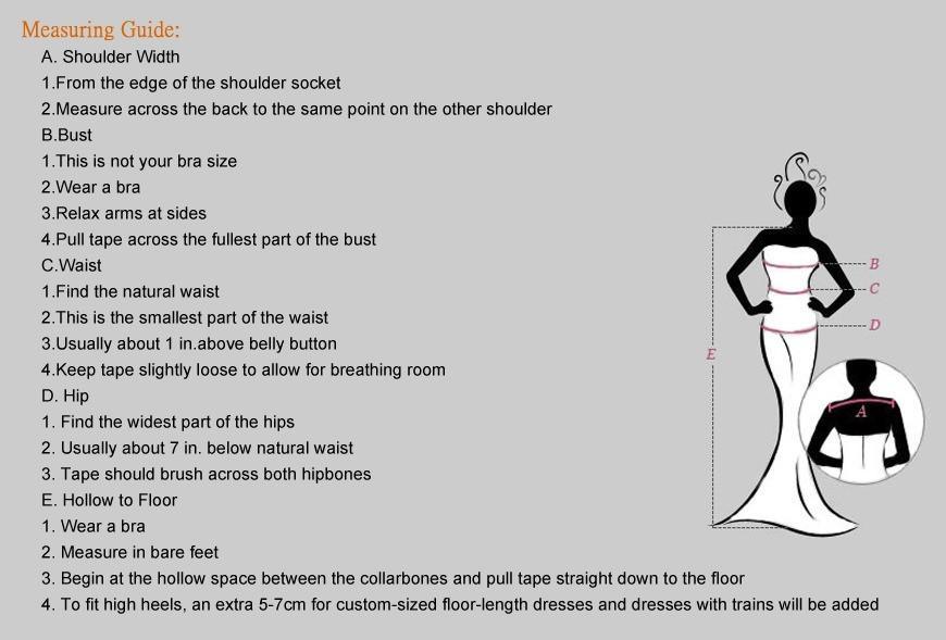 Size:Custom Size. Please check our standard size chart carefully if you choose standard size and make sure the standard size could be fit you well.Your size. (bust). (waist). (hips). (Hollow to Hem). It is very important. Please do use the SIZE CHART IMAGE in the above.If dress is custom made. we need to size as following: