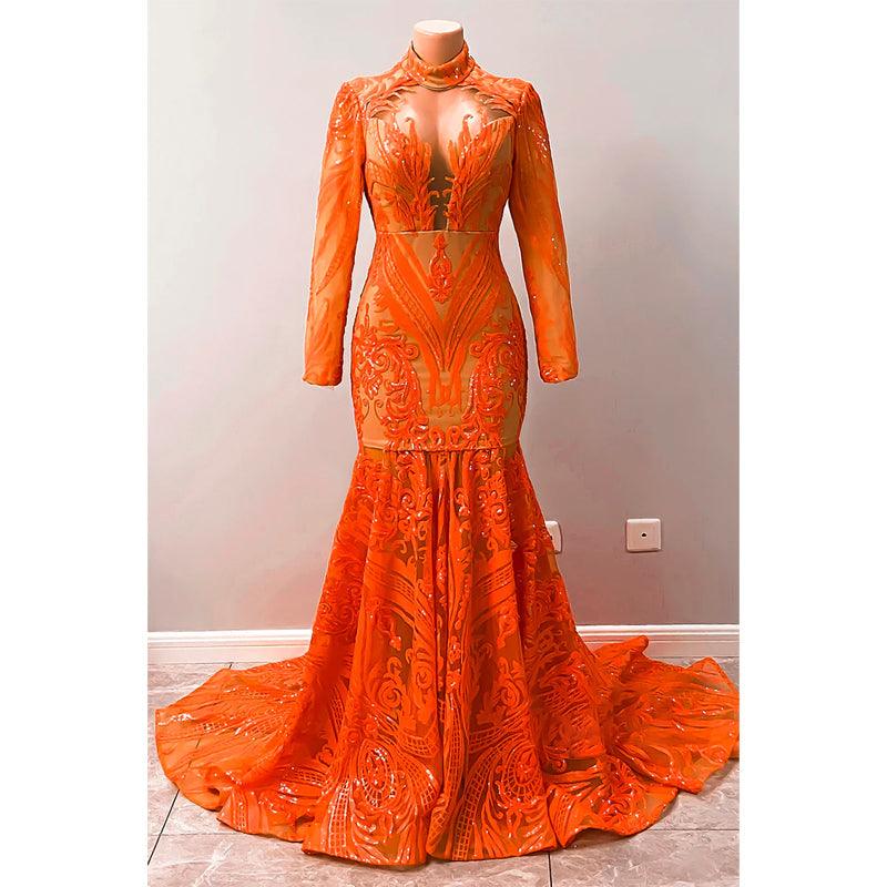 Unique High Neckline Sequins Appliques Long Sleeves America Mermaid Prom Dress