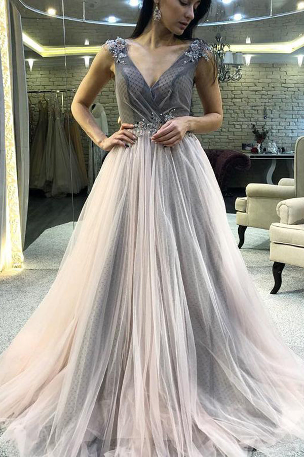 V-neck Grey Long Prom Dresses Appliques Evening Dresses with Beading.MP543