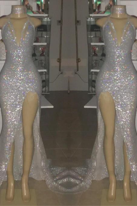 V-Neck Sequins Mermaid Front Slit Long Prom Dress