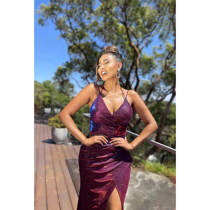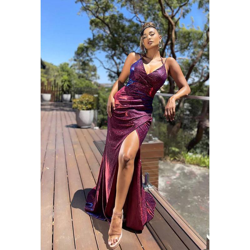 V-Neck Spaghetti Straps Sparkly Ruched Sheath Long Prom Gown