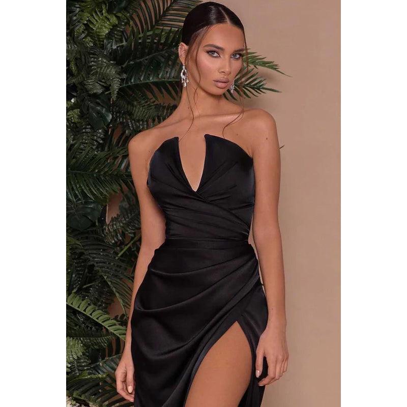 V-Neck Strapless Ruched Sheath Long Prom Evening Dress With Slit
