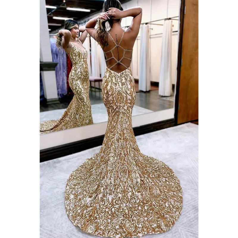 V-neck Straps Mermaid Sequins Long Prom Dress with Slit Evening Gowns