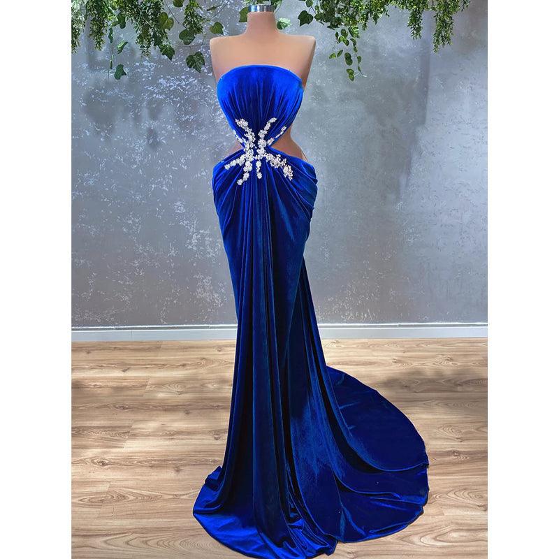 Velvet Beaded Strapless Royal Blue Long Prom Dress with Slit Evening Gowns