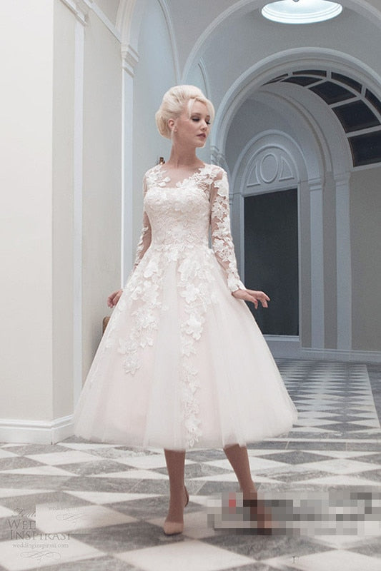 Baoleely vestido de noiva Ball Gown Bateau Appliques Long Sleeve Bridal Dresses New Cheap Custom Short Wedding Dresses