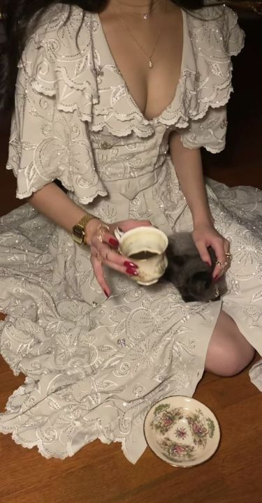 Vintage Satin Sequins Beaded Slit Evening Dress V Neck Formal Prom Dress Y8402