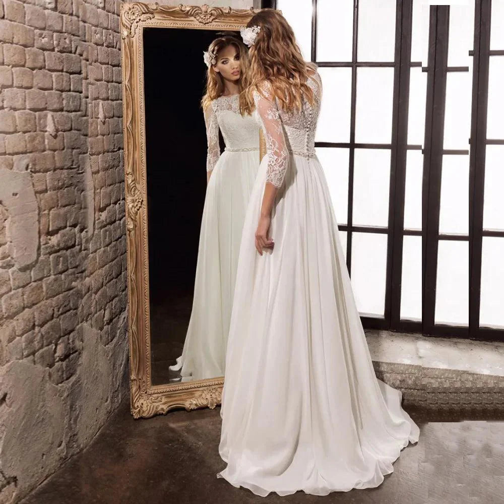 Wedding Dresses Three Quarter Sleeves Top Lace Chiffon Gowns with Beading Sashes