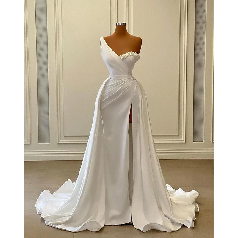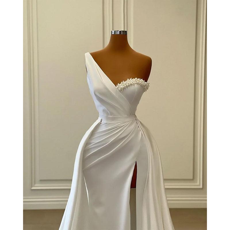 White Elegant One Shoudler Ruched Beaded Slit Mermaid Formal Prom Dress