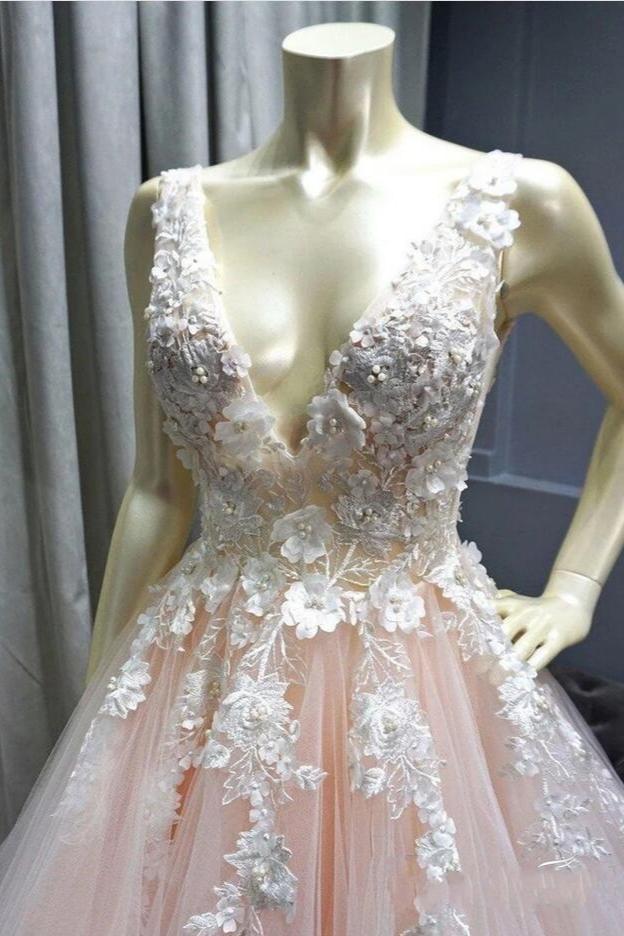 Wide Straps V-Neck Tulle Pink Prom Dress Applique Long