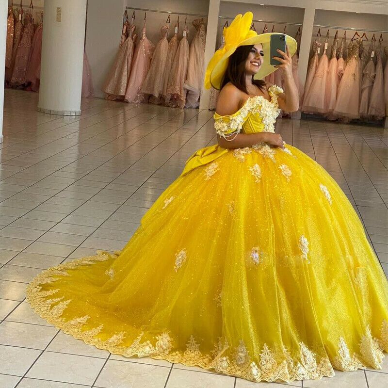 Yellow Ball Gown Quinceanera Dresses Off Shoulder Lace up Back Sweep Train Appliques Beads Y656